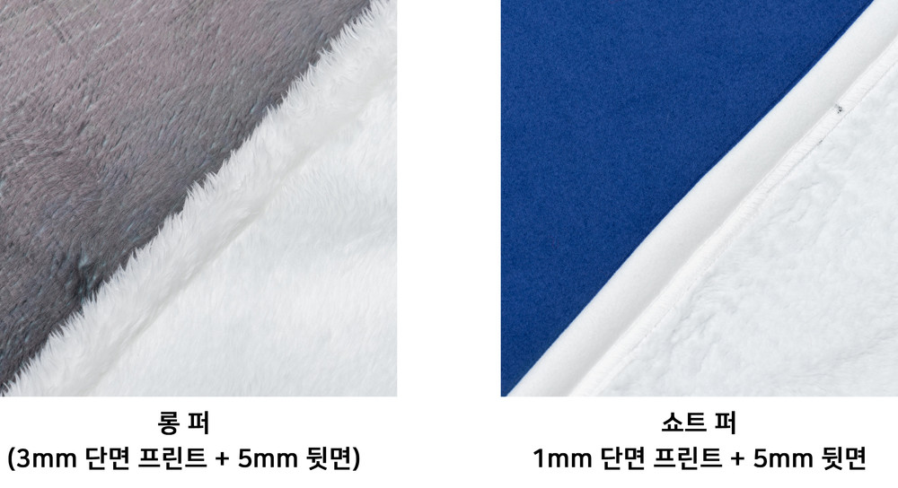 ·담요의 종류는 두 가지입니다.롱 퍼(3mm 단면 프린트 + 5mm 뒷면) 제품은 뒷면에 단면 원단을 덧댄 제품으로 포근한 촉감이 특징입니다. 쇼트 퍼(1mm 단면 프린트 + 5mm 뒷면) 제품은 양면 원단으로 제작되는 상품으로 롱 퍼 제품보다는 좀 더 가볍게 사용하실 수 있습니다. 마감처리 방법에 차이가 있으니 구매 시 참고해주세요.