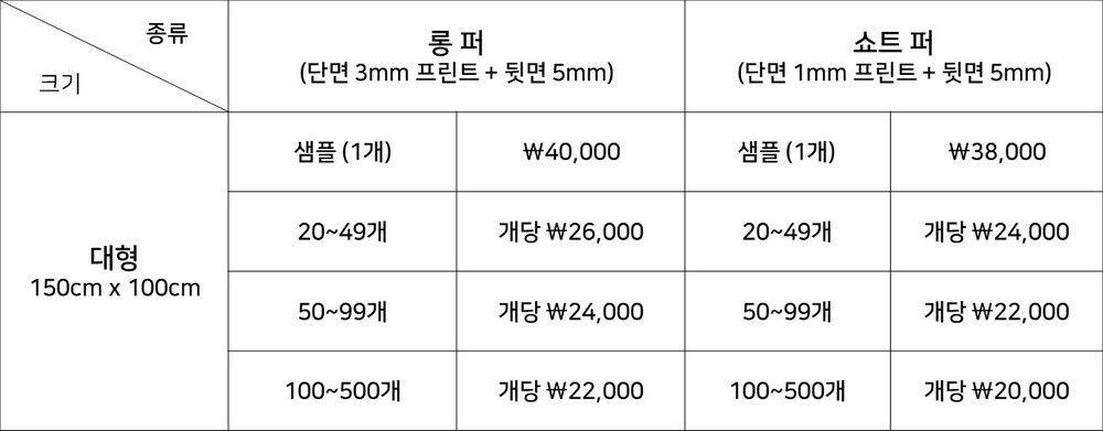·뒷면은 기본 흰색으로 제작 됩니다. (100개 이상 대량 작업 건의 경우 협의 후 롱퍼 뒷면을 검정으로 변경 가능, 쇼트퍼는 뒷면 흰색만 가능)