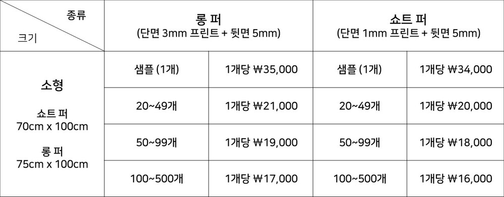 ·각 사이즈, 종류에 대한 단가표는 아래 차트를 확인해주세요. 주문 시 원하는 수량 구간을 먼저 선택 후 실제 주문하는 수량을 선택해주세요. (예: 32개 주문시, 옵션 20~49개 선택 후 주문수량 32 설정, 120개 주문시 옵션 100~500개 선택 후 주문수량 120 설정)